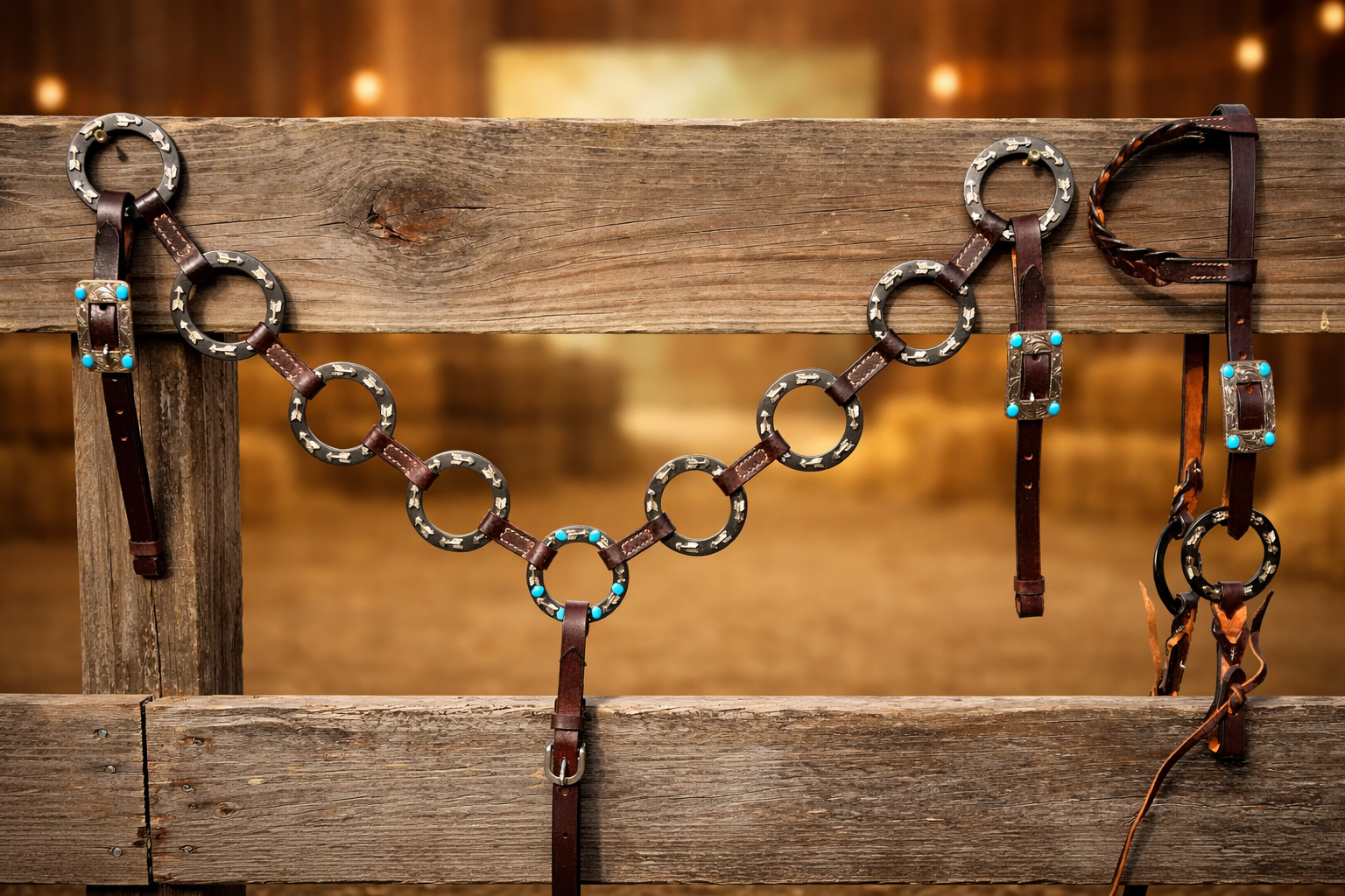 Made from quality dark leather with solid stitching and durable hardware, this set is built to handle the arena while keeping a clean, classy look. The bold ring design paired with turquoise accents gives it a standout presence without being overdone.
